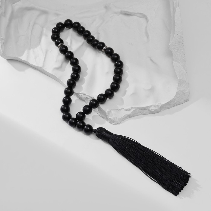 Мусульманские чётки «Чёрный агат» изготовлены из прессованного камня, имеют 35 бусин размером 1 см и текстильную кисточку. Аксессуар предназначен для достижения концентрации и покоя во время медитации, также часто используется как стильное украшение на шею, зеркало машины, оберег или амулет.