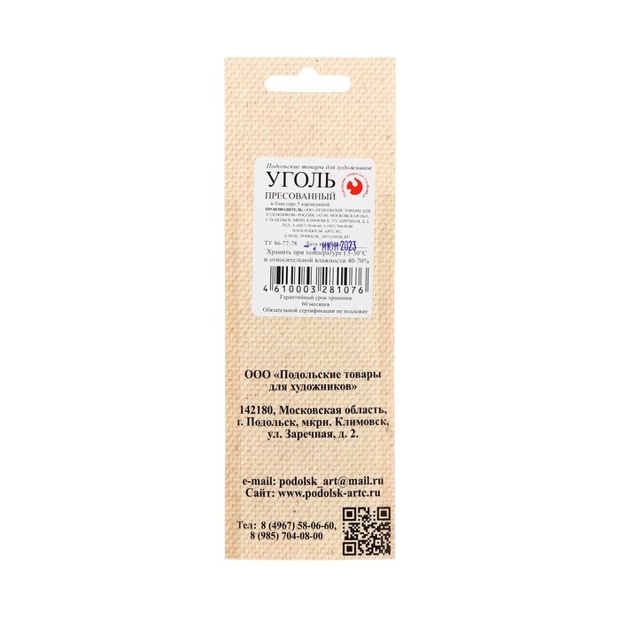 По внешнему виду уголь прессованный представляет собой стержни круглого сечения. Цвет черный. Длина 100 мм диаметр 8 мм, в состав которого входит уголь березовый, сажа газовая, глина. Прессованный уголь предназначается для выполнения различного рода рисунков на бумаге,картоне,грунтованном холсте и других материалах.