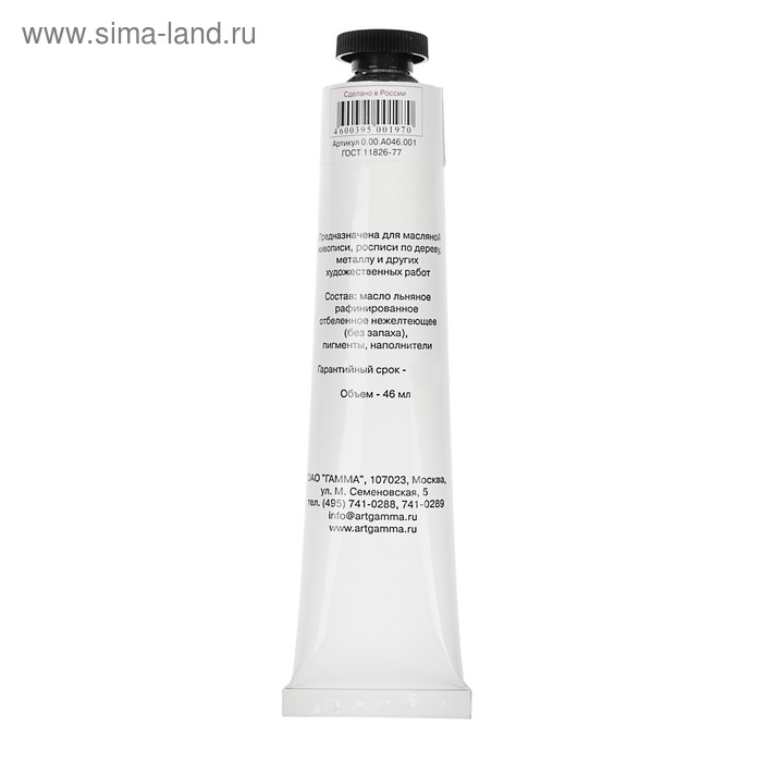 Краска масляная в тубе 46 мл, Гамма "Студия", №001 белила цинковые