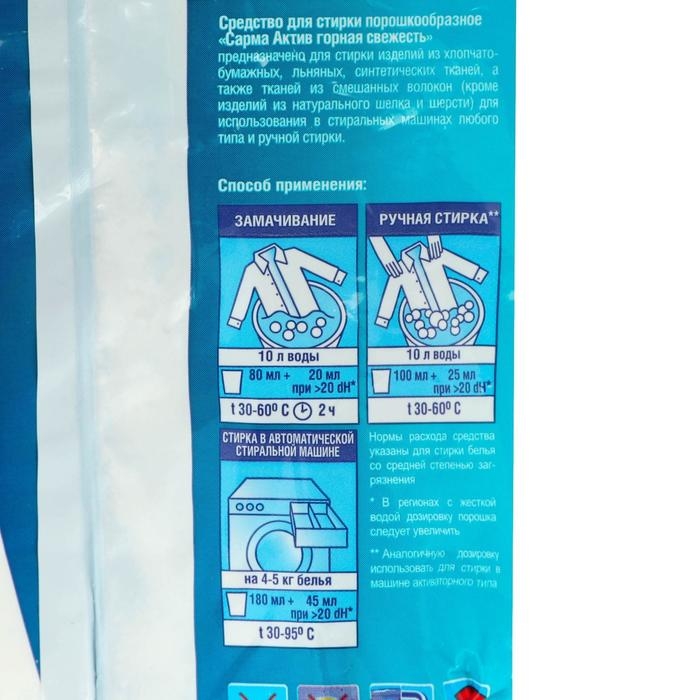Используйте для хлопчатобумажных, льняных, синтетических и смешанных тканей стиральный порошок Sarma «Актив: Горная свежесть».