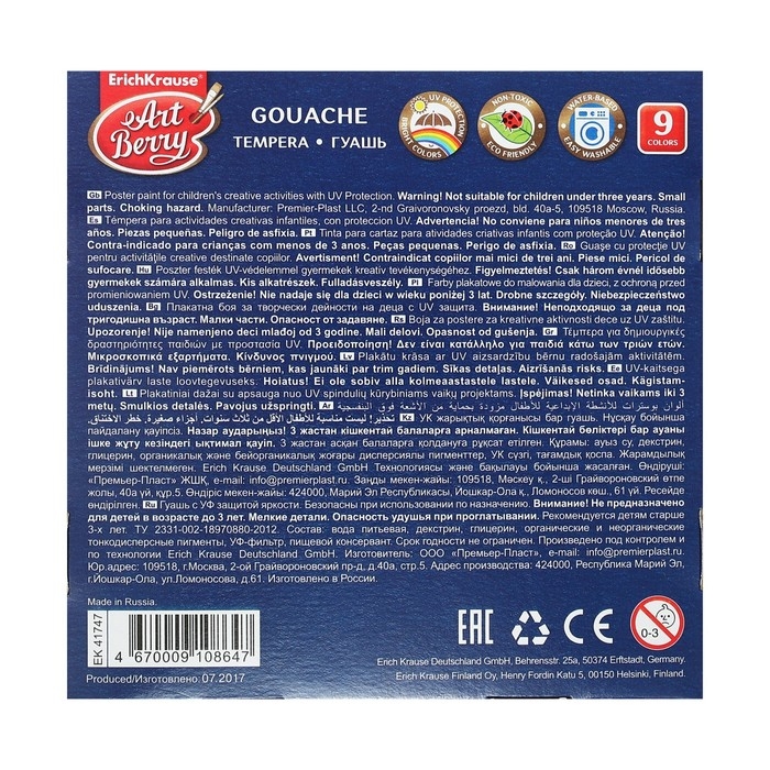 Гуашь 9 цветов х 20 мл, ErichKrause "Jolly Friends", в картонной упаковке