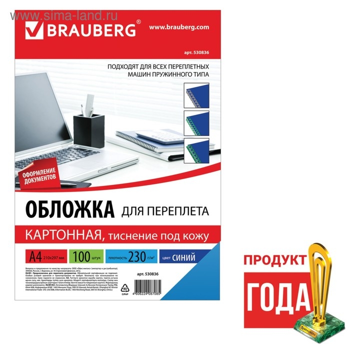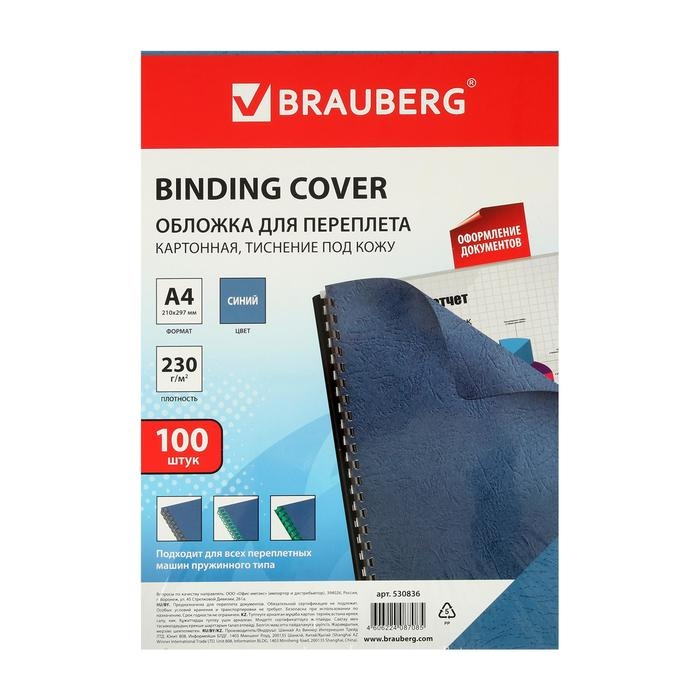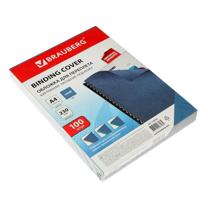 Обложки для переплета BRAUBERG придадут документам эстетичный внешний вид и защитят от повреждений. Предназначены для переплета документов брошюровщиком с помощью пластиковых и металлических пружин. Актуальны для создания деловых брошюр. Выполнены из прочного, износостойкого картона синего цвета плотностью 230 г/м2. Тиснение под кожу. Подходят для документов формата А4. 100 штук в комплекте.