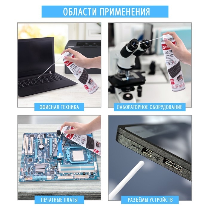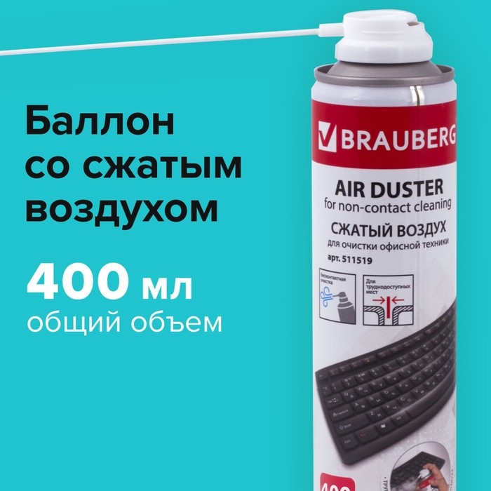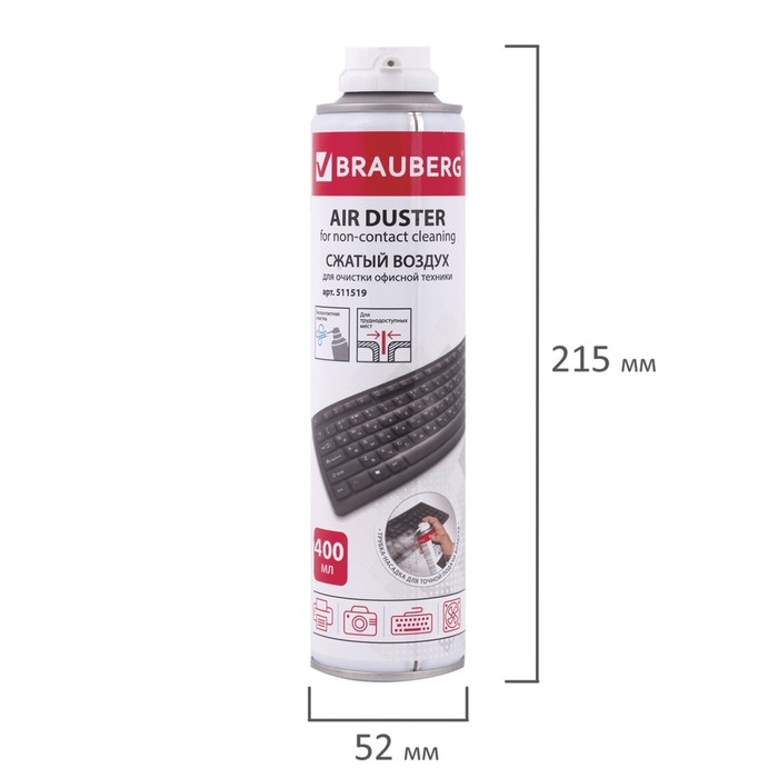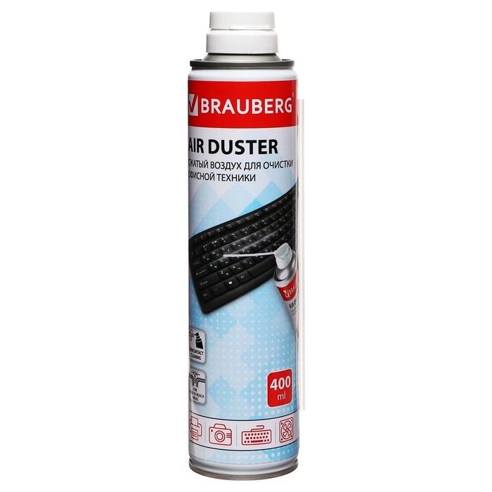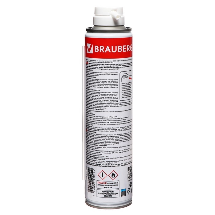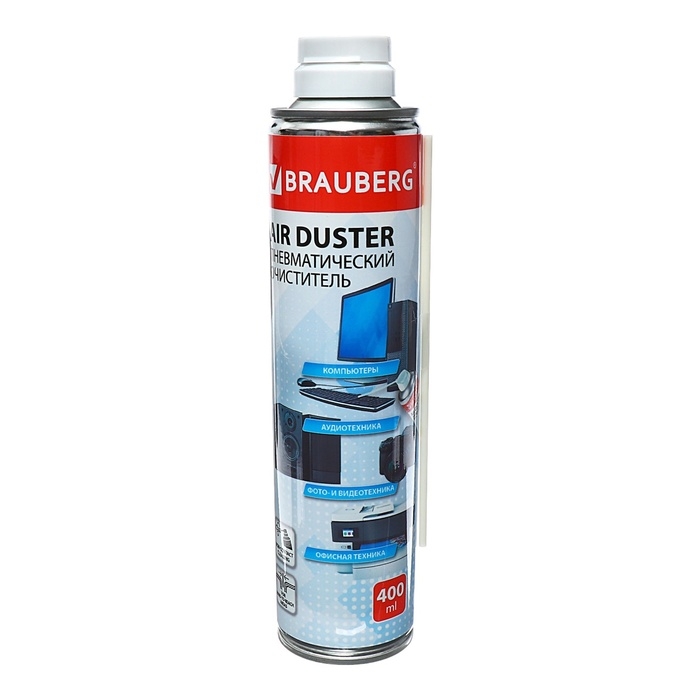 Баллон со сжатым воздухом BRAUBERG предназначен для бесконтактного удаления пыли и мелкого мусора из труднодоступных мест и внутреннего пространства компьютерной техники, аудио-, видео- и фотоаппаратуры, офисной и бытовой техники. Подходит для очистки поверхностей печатных плат, линз оптических приборов, лабораторного, диагностического и другого деликатного оборудования. Распылительная головка с трубочкой позволяет контролировать направление и силу струи очистителя. Не оставляет следов при распылении.При систематическом применении увеличивает срок службы техники.Внимание! Очистку проводить только после отключения устройств от электропитания! В процессе применения средство значительно охлаждает очищаемые детали. Резкое охлаждение горячих деталей может негативно сказаться на их работоспособности и даже вывести их из строя!Применение:1) Установить трубку в распылительную головку (ДЛЯ УСТАНОВКИ ТРУБОЧКИ В ОТВЕРСТИИ КЛАПАНА НЕОБХОДИМО ВСТАВИТЬ ЕЁ С УСИЛИЕМ ДО ПОЛНОЙ ФИКСАЦИИ).2) С расстояния 10–15 см короткими порциями продуть места скопления пыли и загрязнений. Размер баллона - 217х52х52 мм.Состав: пропан >30%, бутан >30%.