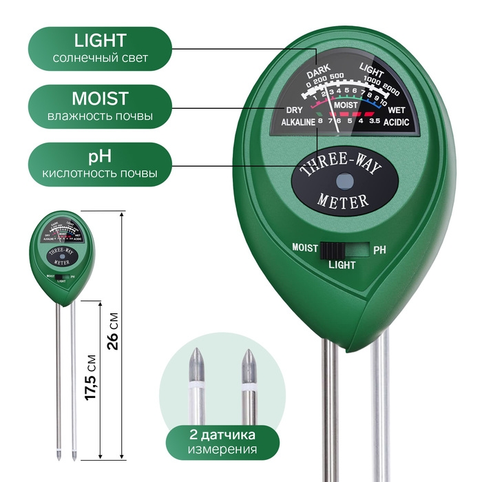 Измеритель почвы 3 в 1: для влажности, кислотности, освещённости, цвет МИКС, Greengo
