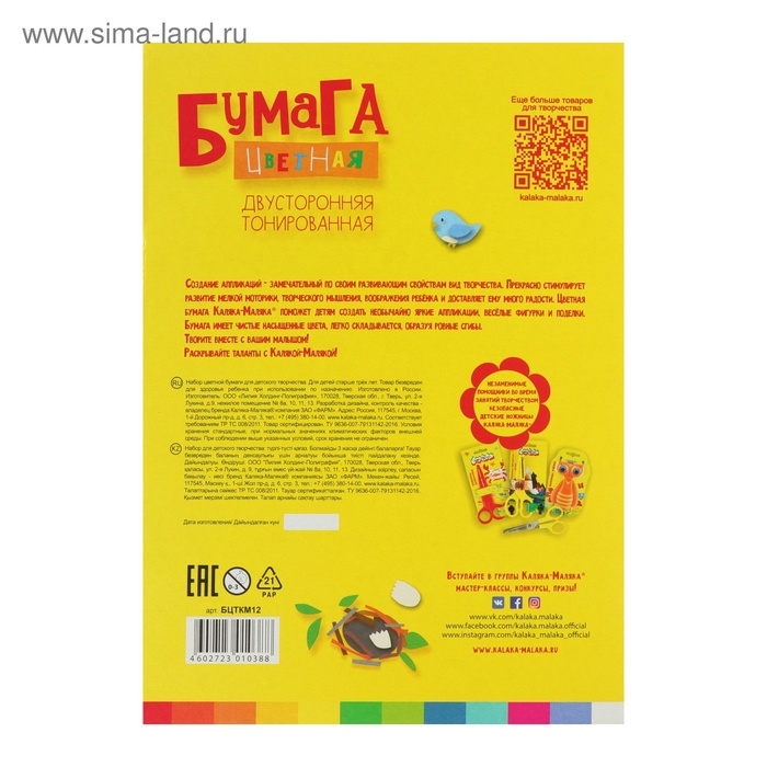 Бумага цветная двусторонняя А4, 12 листов, 12 цветов «Каляка-Маляка»