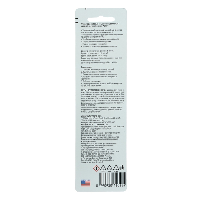 Фиксатор резьбы синий ABRO, 6 мл, удаляемый TL-342