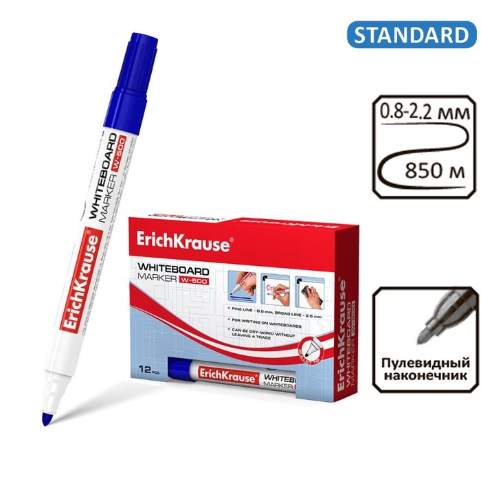 Маркер для доски ErichKrause W-500, 0.8-2.5 мм, для письма на досках сухого стирания, чернила на спиртовой основе без ксилола, синий