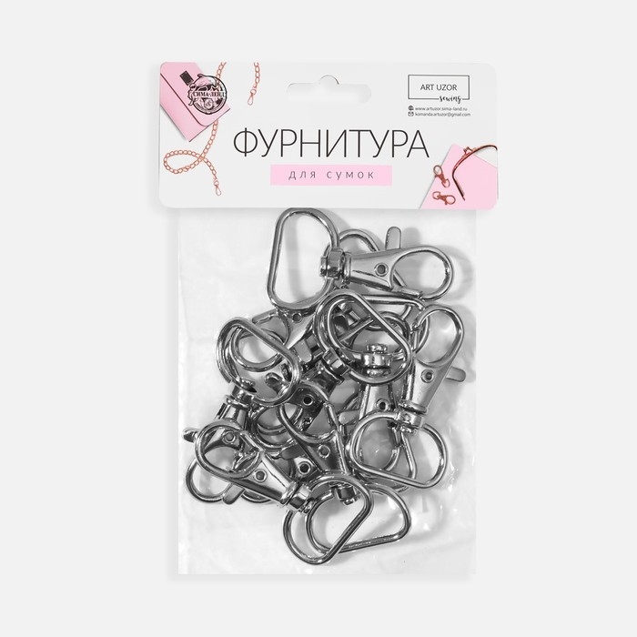 Металлический карабин предназначен для крепления ремней, ручек или декоративных элементов к сумке. Изготовлен из прочного металла, имеет гладкую поверхность и элегантный вид, что делает его не только функциональным, но и стильным элементом фурнитуры.