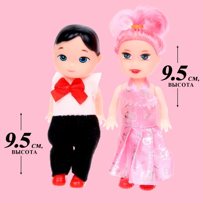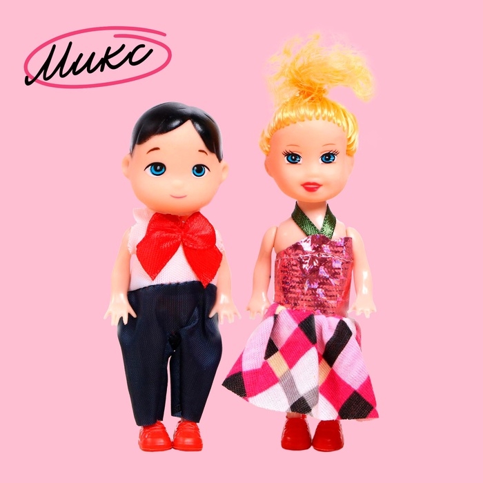 Малышка Люба с модными фиолетовыми волосами и её друг Гриша ждут ребёнка для весёлой игры. Рост кукол составляет 9,5 см. Выполнены из пластика. Ноги кукол сгибаются — это позволяет им принимать сидячее положение.