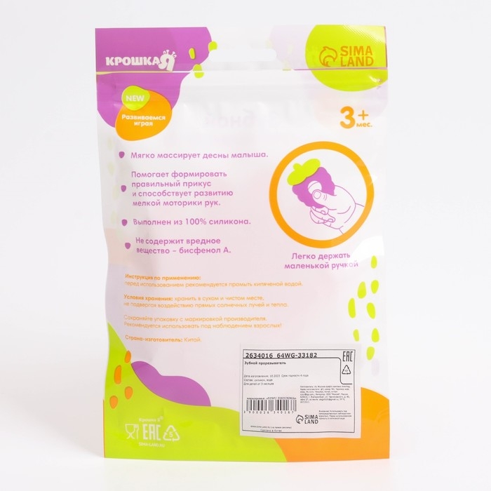 Прорезыватель снимает неприятные ощущения в период появления первых зубов. Также изделие подготовит ребёнка к процессу жевания, поспособствует формированию правильного прикуса и развитию мелкой моторики рук.