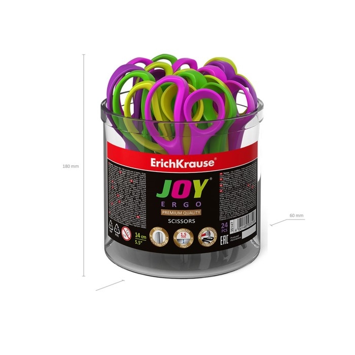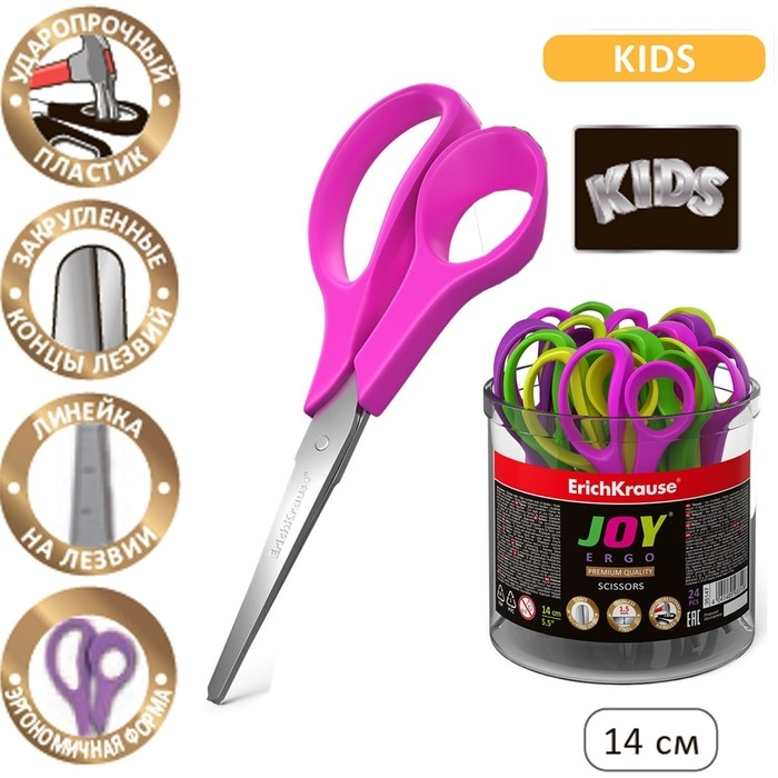 Ножницы детские 14 см, ErichKrause Joy Ergo, в стакане, с закруглёнными концами лезвий и линейкой, МИКС