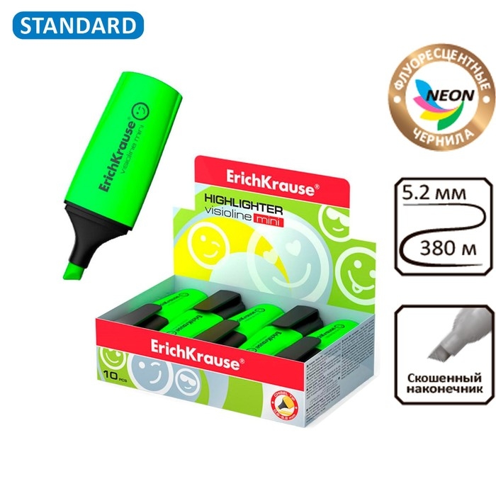 Маркер текстовыделитель ErichKrause Visioline Mini, 0.6-5.2 мм, флуоресцентные чернила на водной основе, зелёный