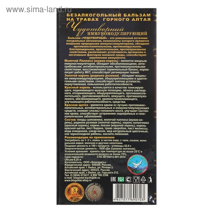 Состав: плоды шиповника, молочай Палласа (мужик-корень), родиола розовая (золотой корень), корень копеечника (красный корень), корень левзеи (маралий корень), корень красной щётки, лист бадана, трава зверобоя, лист мелиссы, вода очищенная, сахар-песок, мёд натуральный цветочный, сок черноплодной рябины, кислота лимонная.