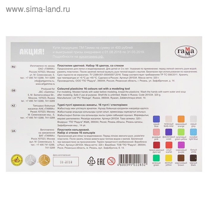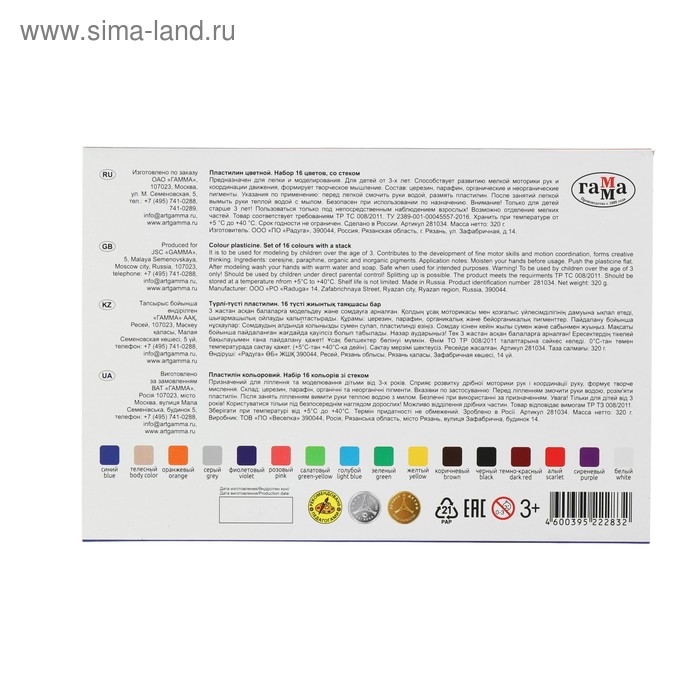 Пластилин 16 цветов 320 г, Гамма "Классический", со стеком, картонная упаковка 281034