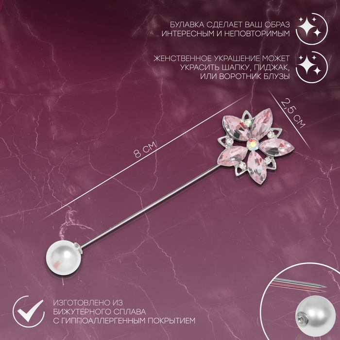 Данная булавка – настоящая находка для модниц, предпочитающих нетривиальные аксессуары. Брошь-булавка станет не только оригинальным дополнением вашего наряда, но и позволит без труда приколоть при необходимости палантин или шейный платок. Используйте её в качестве украшения шляпки, рубашки или галстука. Булавка «Цветок» сирень, 8 см, цвет розовый в серебре внесёт особую нотку изящности в ваш образ.