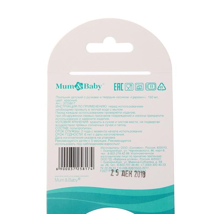 Качество товара подтверждается сертификатом соответствия ЕАС. Поильник выполнен из безопасного пластика, предназначенного для производства детской посуды.