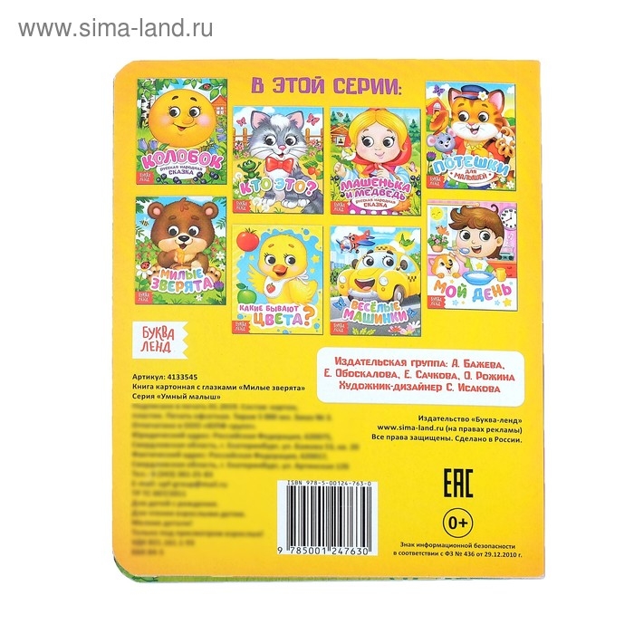 Книга сделана из плотного картона, поэтому прослужит долго. Каждый разворот имеет своего персонажа с забавными глазками, которые привлекут внимание малыша. Также внутри вы найдёте рассказы в стихотворной форме.