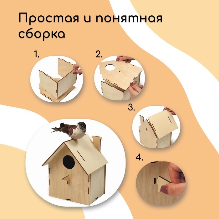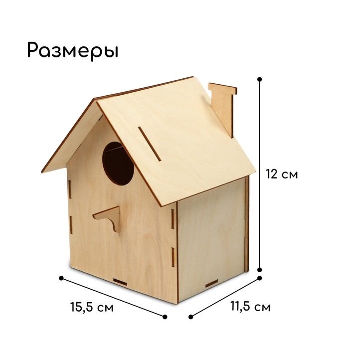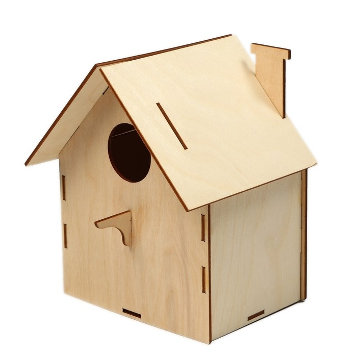 Чтобы собрать кормушку, аккуратно соедините фанерные детали, вставляя их в пазы. Используйте клей для лучшей фиксации. При желании модель можно раскрасить или задекорировать.