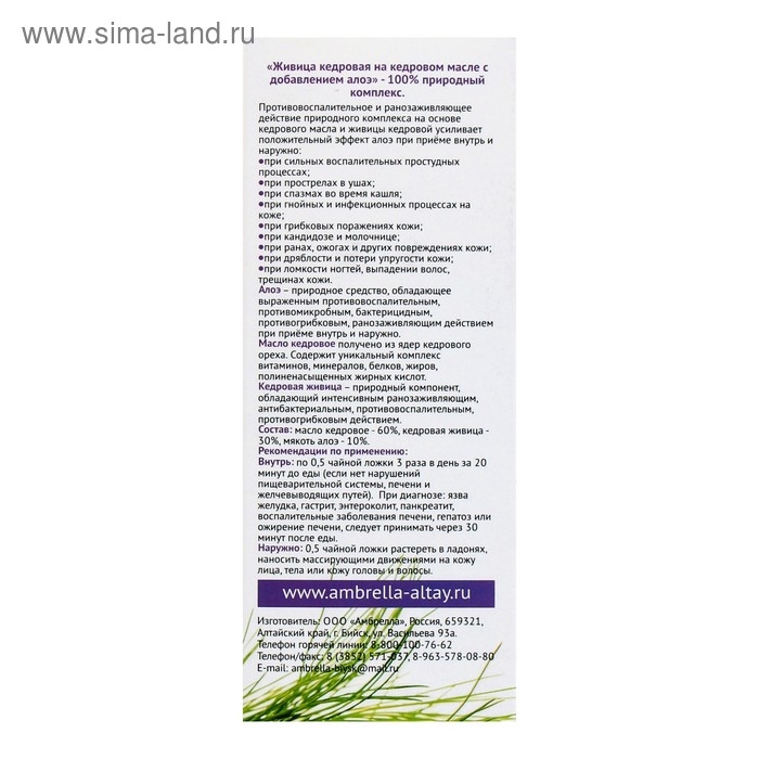 «Живица кедровая на кедровом масле с добавлением алоэ» — 100%-ый природный комплекс.