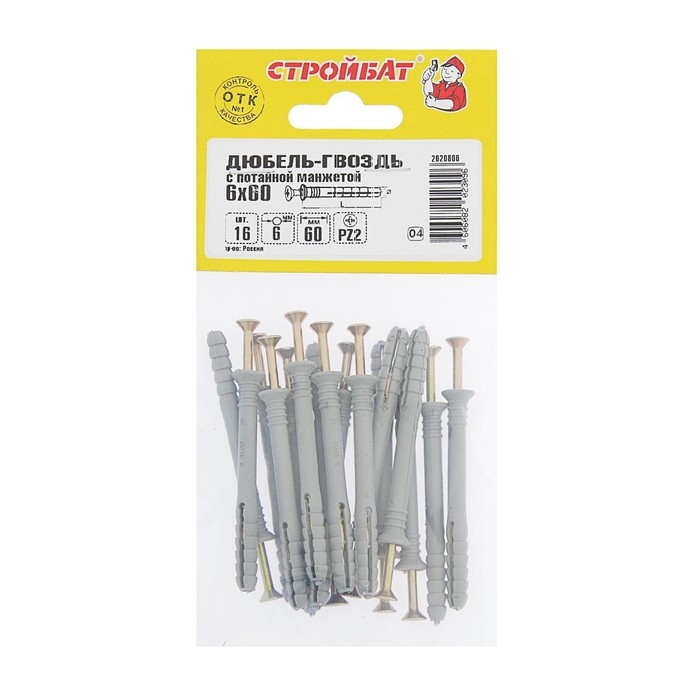 Дюбель-гвоздь "Стройбат", полипропиленовый, потайная манжета, 6x60 мм, 16 шт