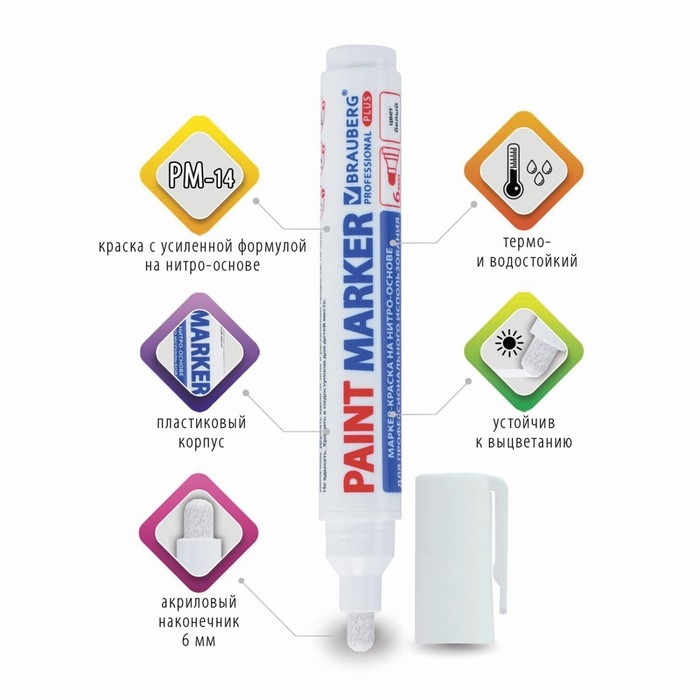 Маркер-краска лаковый BRAUBERG предназначен для маркировки различных материалов в промышленных условиях: бетона, дерева, стекла, металла, резины, пластика. Заправлен краской с усиленной формулой на нитро-основе РМ-14. СПОСОБ ПРИМЕНЕНИЯ:1. Перед использованием хорошо встряхнуть с закрытым колпачком.2. Снять колпачок, надавить на наконечник, дождаться, когда краска полностью пропитает его.3. После использования плотно закрыть колпачок.Чернила с лаковым эффектом производства компании MULTICHEM являются экологичными и безопасными для окружающей среды. Благодаря усиленной формуле идеально подходят для нанесения долговечной маркировки на любых поверхностях, включая влажные. Отличаются термо- и водостойкостью, устойчивы к выцветанию. Пишет по сухим, жирным, грязным, ржавым и влажным поверхностям. Ширина линии письма составляет 6 мм. Прочный круглый наконечник выполнен из пористого акрила. Пластиковый корпус.