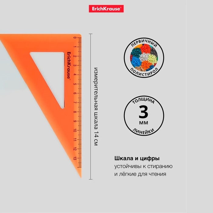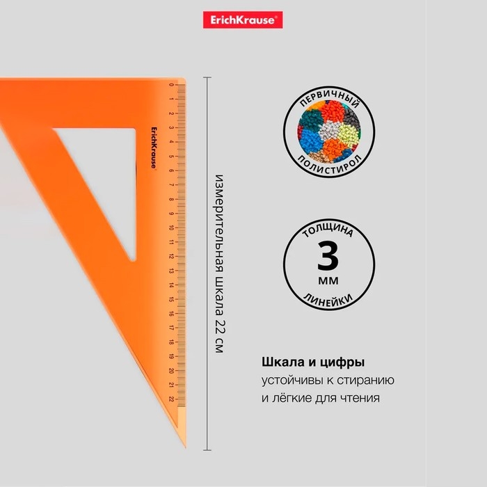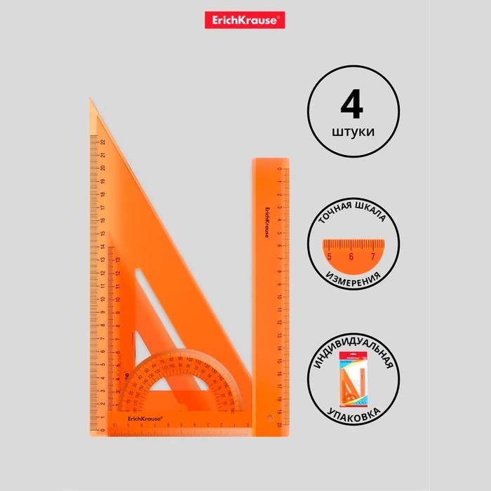 Набор чертежный средний 4 предмета ErichKrause (линейка 20 см, угольник 13 см и 22 см, транспортир) оранжевый