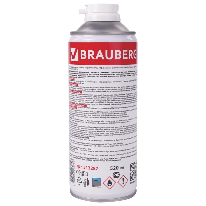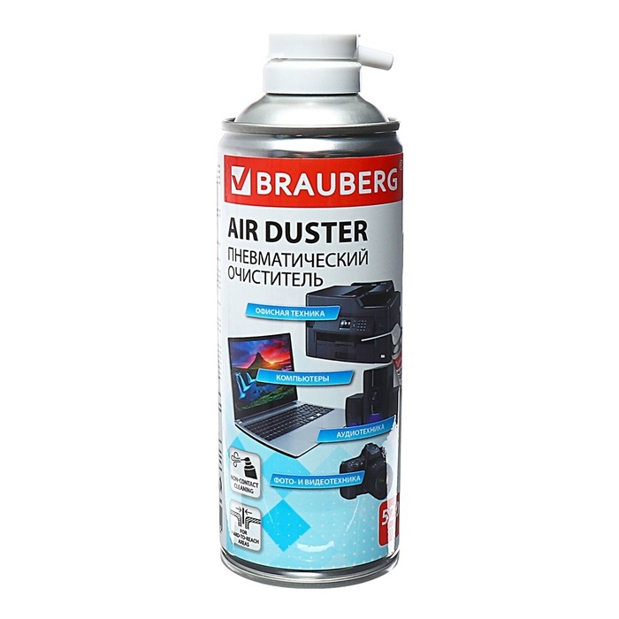 Баллон со сжатым воздухом BRAUBERG предназначен для бесконтактного удаления пыли и мелкого мусора из труднодоступных мест и внутреннего пространства компьютерной техники, аудио-, видео- и фотоаппаратуры, офисной и бытовой техники. Подходит для очистки поверхностей печатных плат, линз оптических приборов, лабораторного, диагностического и другого деликатного оборудования. Распылительная головка с трубочкой позволяет контролировать направление и силу струи очистителя. Не оставляет следов при распылении.При систематическом применении увеличивает срок службы техники.Внимание! Очистку проводить только после отключения устройств от электропитания! В процессе применения средство значительно охлаждает очищаемые детали. Резкое охлаждение горячих деталей может негативно сказаться на их работоспособности и даже вывести их из строя!Применение:1) Установить трубку в распылительную головку (ДЛЯ УСТАНОВКИ ТРУБОЧКИ В ОТВЕРСТИИ КЛАПАНА НЕОБХОДИМО ВСТАВИТЬ ЕЁ С УСИЛИЕМ ДО ПОЛНОЙ ФИКСАЦИИ).2) С расстояния 10–15 см короткими порциями продуть места скопления пыли и загрязнений. Объем - 520 мл. Размер баллона - 183х66х66 мм.Состав: пропан >30%, бутан >30%.