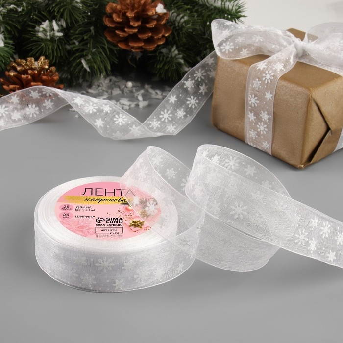 Новый год! Лента капроновая «Снежинки», 25 мм × 23 ± 1 м, цвет серебряный/белый
