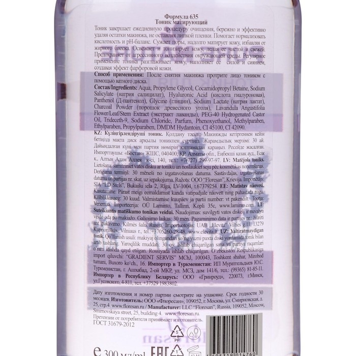 Матирующий тоник бережно и эффективно удаляет остатки макияжа, не оставляя липкой пленки. Активированный уголь мягко абсорбирует загрязнения и токсины, эффективно очищая кожу. Экстракт лаванды смягчает, а гиалуроновая кислота надолго увлажняет кожу. Нормализует кислотность и pH-баланс. Регулярное применение тоника сужает поры, матирует кожу, избавляя от жирного блеска и создавая эффект фарфоровой кожи.