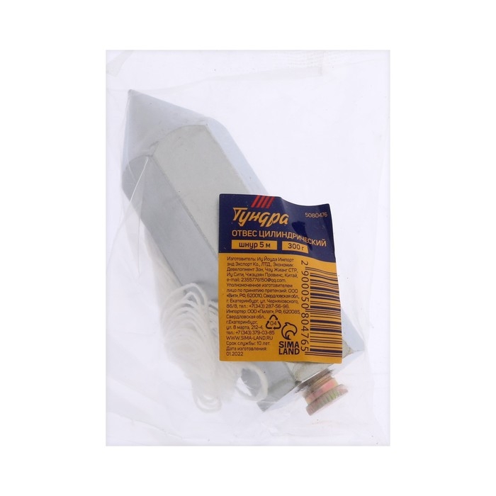 Отвес цилиндрический ТУНДРА, шнур 5 метров, 300 г