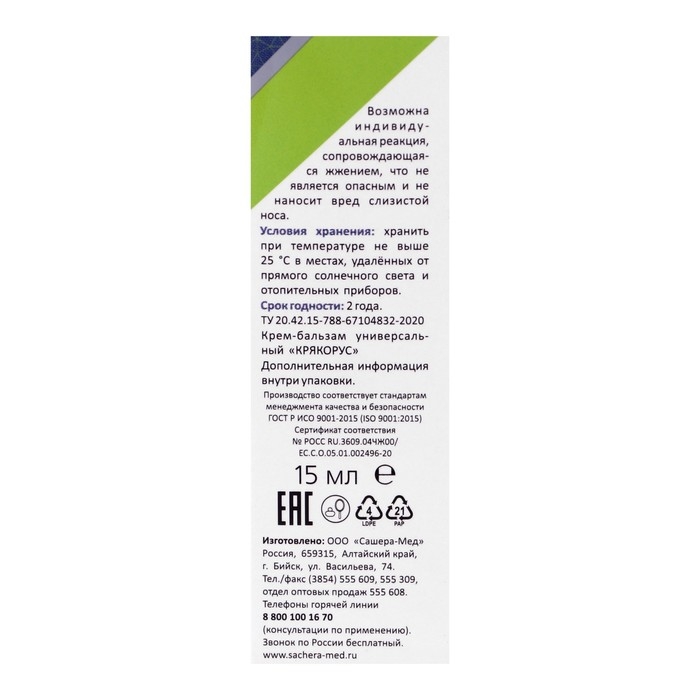 Крем-бальзам «Крякорус», назальный нейтрализатор инфекций, 15 мл