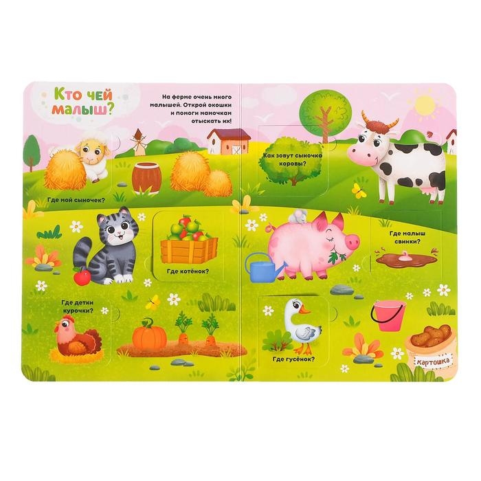 На страницах книги малыш встретит животных, которых можно увидеть на ферме, а ещё — много интересных вопросов о них. Чтобы узнать ответ, достаточно посмотреть, кто спрятался в окошке.