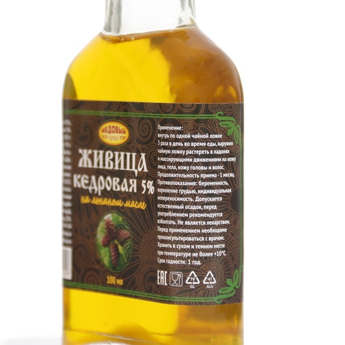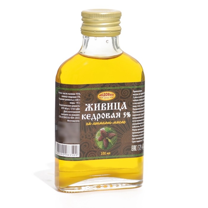 Кедровая живица на льняном масле (терпентиновый бальзам). Кедр издревле почитался жителями Сибири, а его смолу они считали духом векового дерева. Наши предки заметили, что смола Сибирского кедра обладает антисептическими свойствами, восстанавливает силы, укрепляет здоровье, борется с различными недугами. При сочетании кедровой живицы с льняным маслом получается уникальный терпентиновый бальзам, обладающий более мощным лечебным эффектом. Оба компонента дополняют и усиливают действия друг друга. Заживляет и обеззараживает раны и язвы, ускоряет процесс регенерации кожи, эффективно применяется при простудных заболеваниях, бронхите, тонзиллите, уничтожает грибковые инфекций, восстанавливает суставы, улучшает кровообращение и работу ЖКТ, благоприятно влияет на нервную систему.