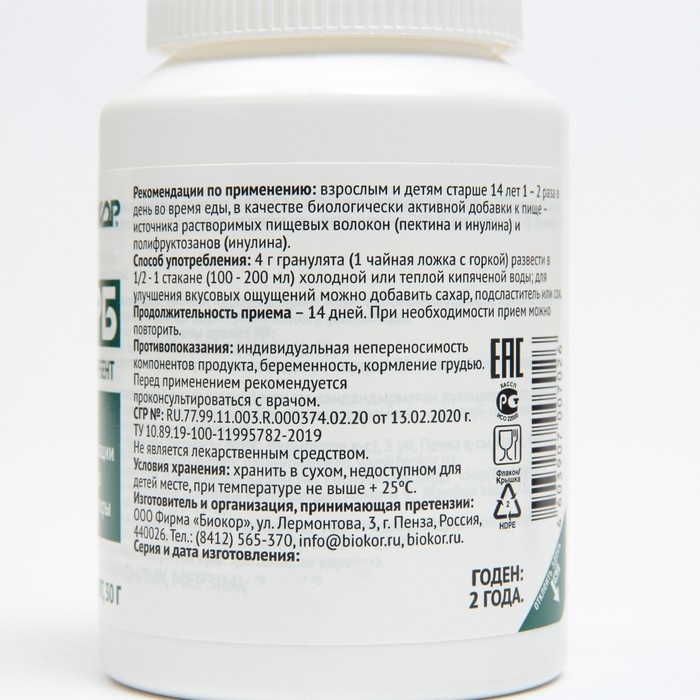 Назначение: в качестве биологически активной добавки к пище – источника растворимых пищевых волокон (пектина и инулина) и полифруктозанов (инулина).