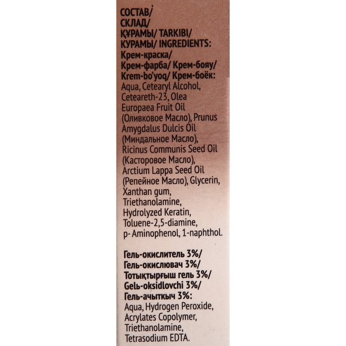 Состав: Крем-окислитель: Aqua, Cetearyl Alcohol, Ceteareth-23, Olea Europaea Fruit Oil (Оливковое Масло), Prunus Amygdalus Dulcis Oil (Миндальное Масло), Ricinus Communis Seed Oil (Касторовое Масло), Arctium Lappa Seed Oil (Репейное Масло), Glycerin, Xanthan gum, Triethanolamine, Hydrolyzed Keratin, Toluene-2,5-diamine, p- Aminofenol. Проявляющая эмульсия 3%: Aqua, Hydrogen Peroxide, Acrylates Copolymer, Triethanolamine, Tetrasodium EDTA.