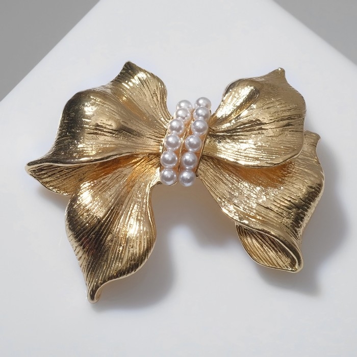 Брошь «Бант» с жемчужной лентой, цвет белый в золоте
