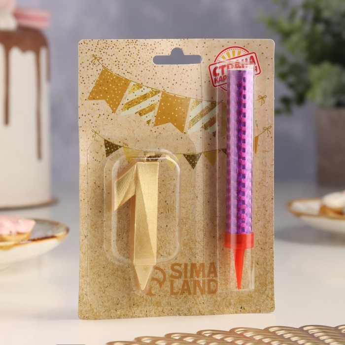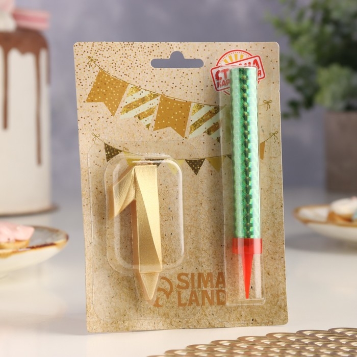 Свеча для торта цифра "Грань + фонтан" золотая "1"