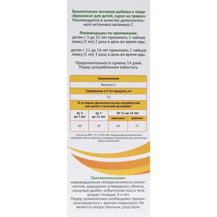 Способ применения: детям с 3 до 11 лет принимать 1 чайную ложку (5 мл) 2 раза в день во время еды, детям с 11 до 14 лет принимать 1 чайную ложку (5 мл) 3 раза в день во время еды.