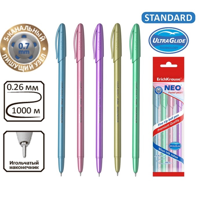 Набор ручек шариковых ErichKrause Neo Pastel pearl, узел 0.7 мм, чернила синие, длина линии письма 1000 метров, 4 штуки, МИКС