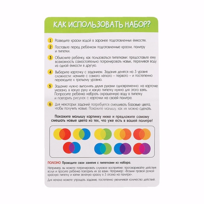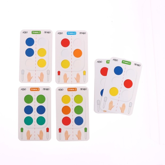 Внутри вы найдёте 4 цветные пипетки, 4 баночки с краской, палитру и карточки с 20 заданиями.