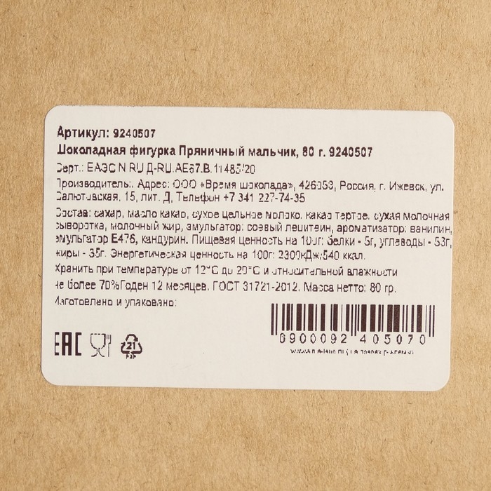Шоколадная фигурка Пряничный мальчик, 80 г
