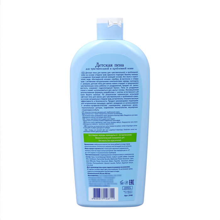 Благодаря мягкой моющей основе без мыла и красителей, воде обогащенной ионами серебра, Д-Пантенолу и отвару трав с активными компонентами череды, календулы и ромашки, детская пена для ванны нежно очищает и предохраняет чувствительную кожу ребенка от раздражений, придает ей шелковистость, сохраняет гидролипидный баланс.