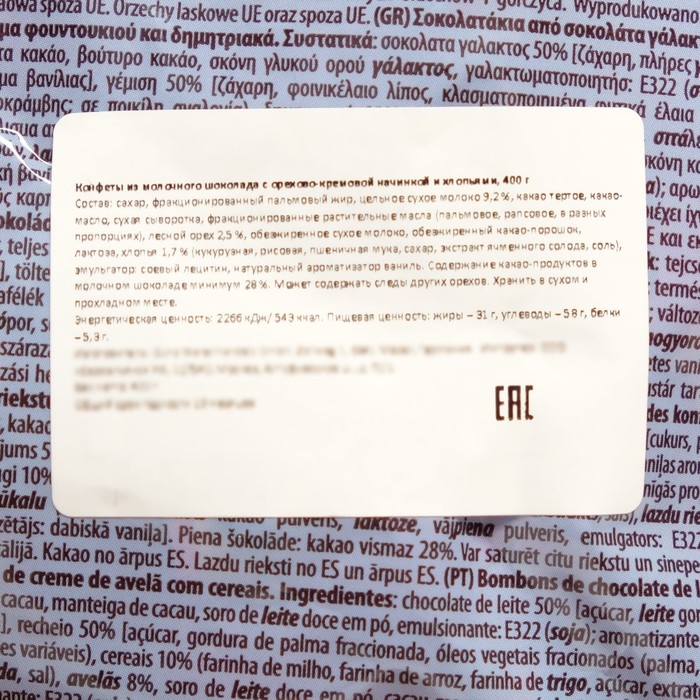 Конфеты из молочного шоколада с орехово-кремовой начинкой и хлопьями, 400 г