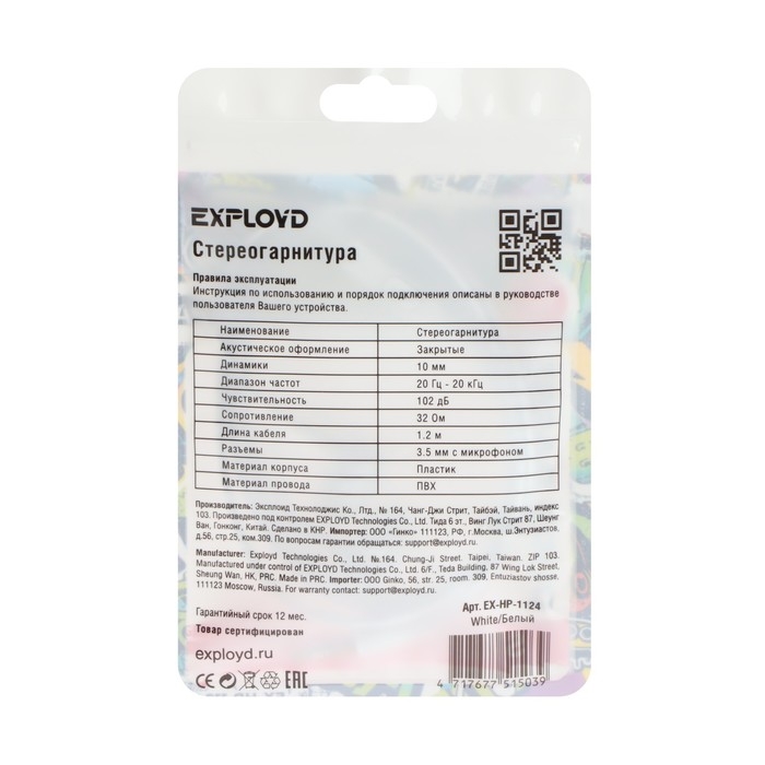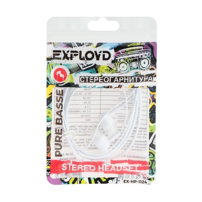 Наушники Exployd EX-HP-1124, вакуумные, микрофон, 102 дБ, 32 Ом, 3.5 мм, 1.2 м, белые