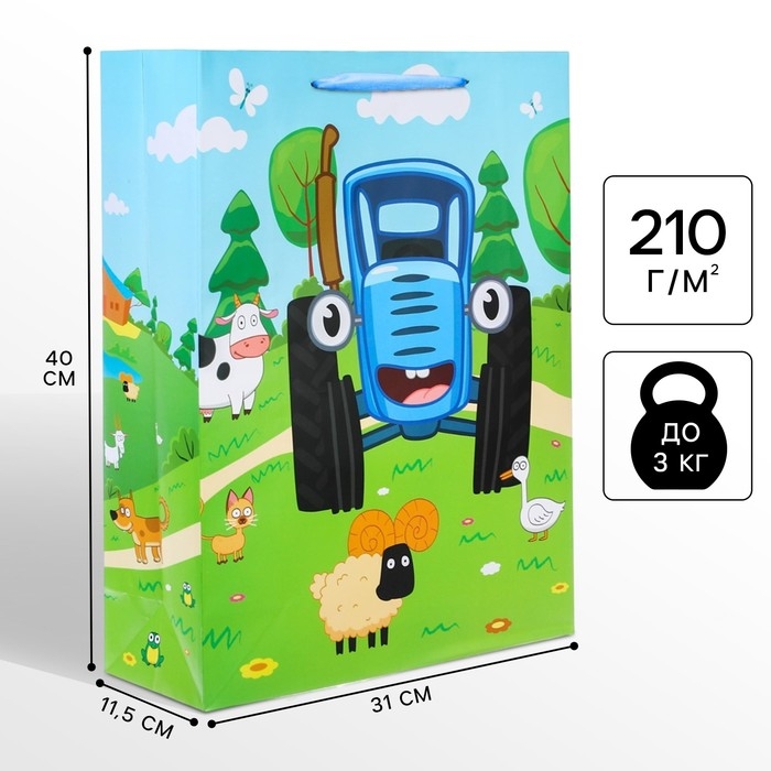 Пакет подарочный "По полям" 31х40х11.5 см, упаковка, Синий трактор