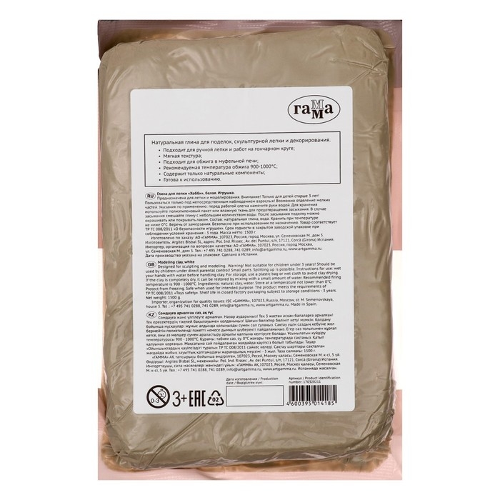 Глина натуральная для лепки 1500 г, белая, Гамма "Хобби", (подходит для обжига) вакуумированная /Испания/