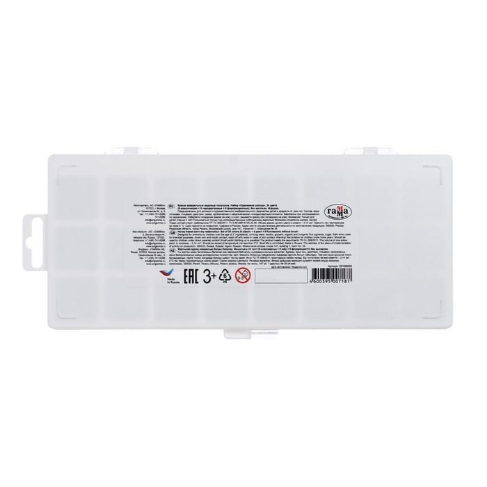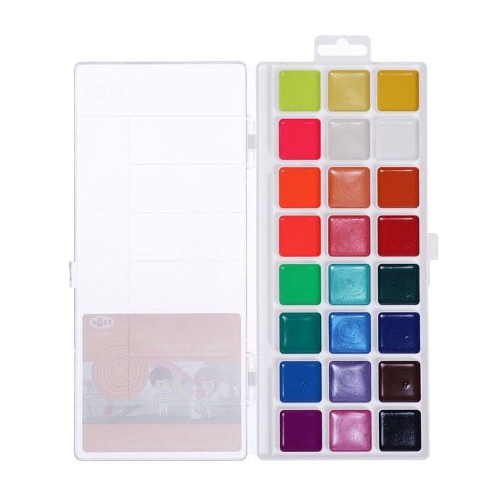 Акварель безопасна для детей. Удобный пластиковый пенал, крышка плотно фиксируется и служит палитрой для смешивания красок.