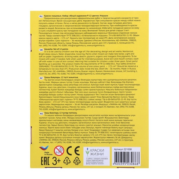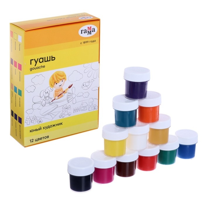 Гуашь 12 цветов по 17,5 мл Гамма "Юный художник", картонная упаковка 221008