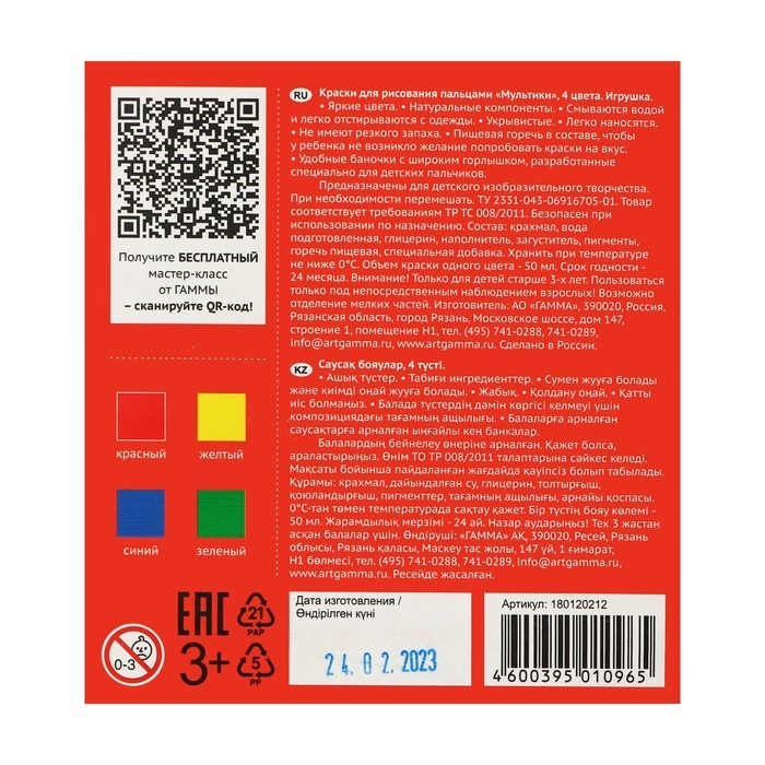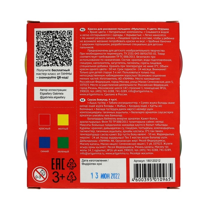Пальчиковые краски - это яркие цвета, приятная плотная текстура, легкое нанесение, хорошая укрывистость, натуральные и безопасные компоненты. Краски легко смываются водой и отстирываются с одежды. Содержат пищевую горечь в составе, чтобы у ребенка не возникло желание попробовать краски на вкус.