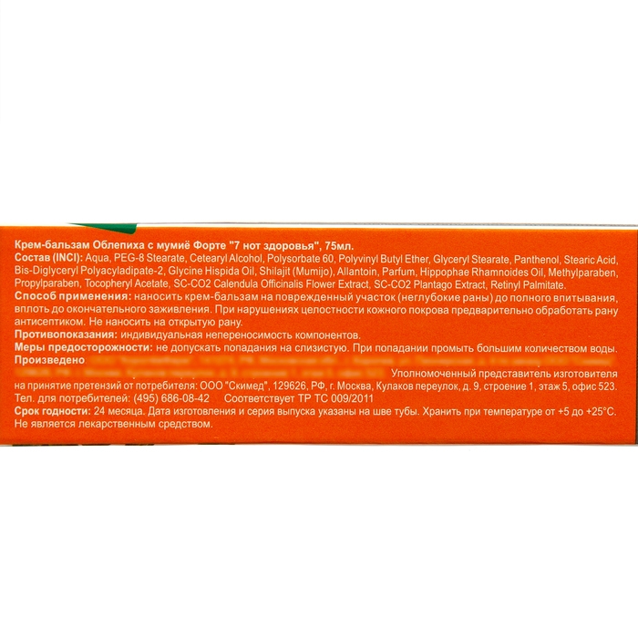 Крем-бальзам 7 нот здоровья "Облепиха Форте" высокоэффективный крем-бальзам с ярко выраженным ранозаживляющим действием: обладает повышенным содержанием облепихового масла и мумиё, используются компоненты высочайшего качества: специально очищенное алтайское мумие и облепиховое масло с высоким содержанием каратиноидов.